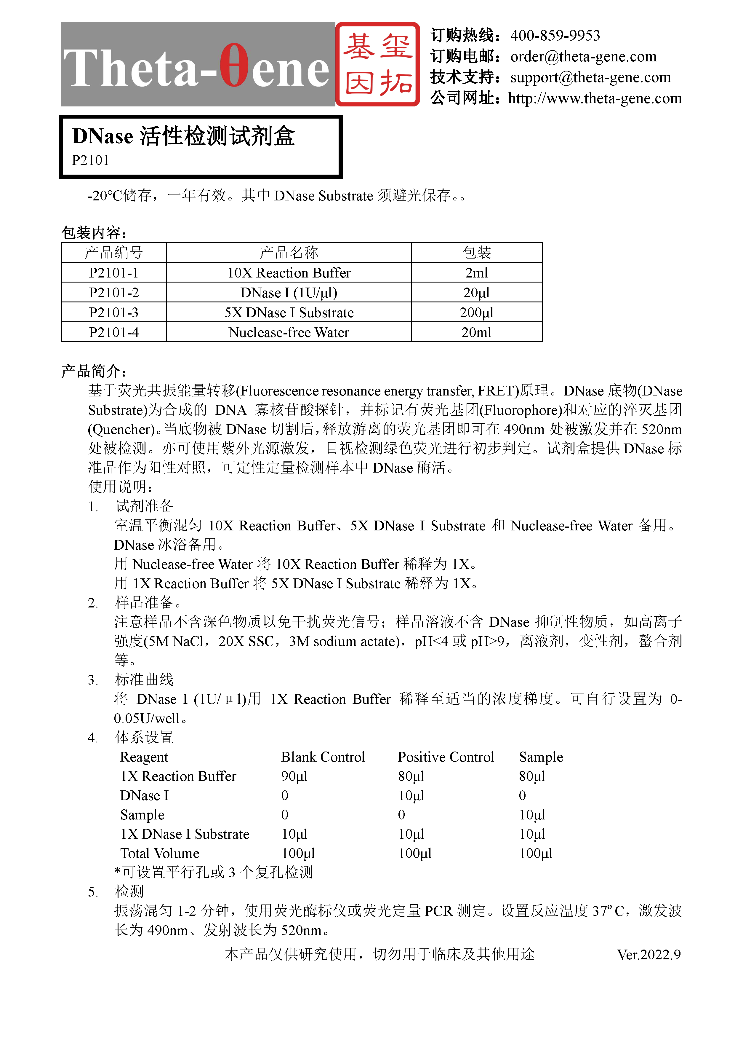 基于荧光共振能量转移(Fluorescence resonance energy transfer, FRET)原理。DNase底物(DNase Substrate)为合成的DNA寡核苷酸探针,并标记有荧光基团(Fluorophore)和对应的淬灭基团(Quencher)。当底物被DNase切割后,释放游离的荧光基团即可在490nm处被激发并在520nm处被检测。亦可使用紫外光源激发,目视检测绿色荧光进行初步判定。试剂盒提供DNase标准品作为阳性对照,可定性定量检测样本中DNase酶活。