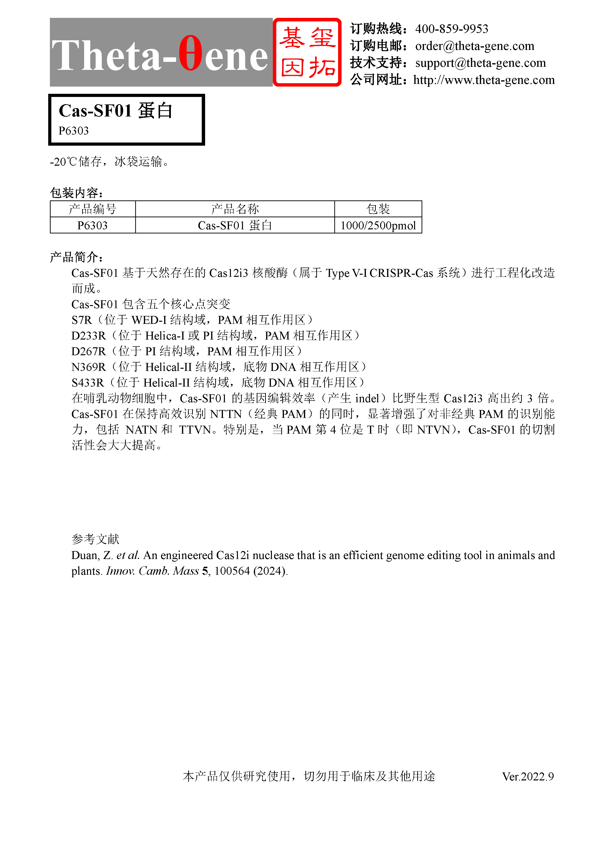 Cas-SF01基于天然存在的Cas12i3核酸酶(属于Type V-I CRISPR-Cas系统)进行工程化改造而成。