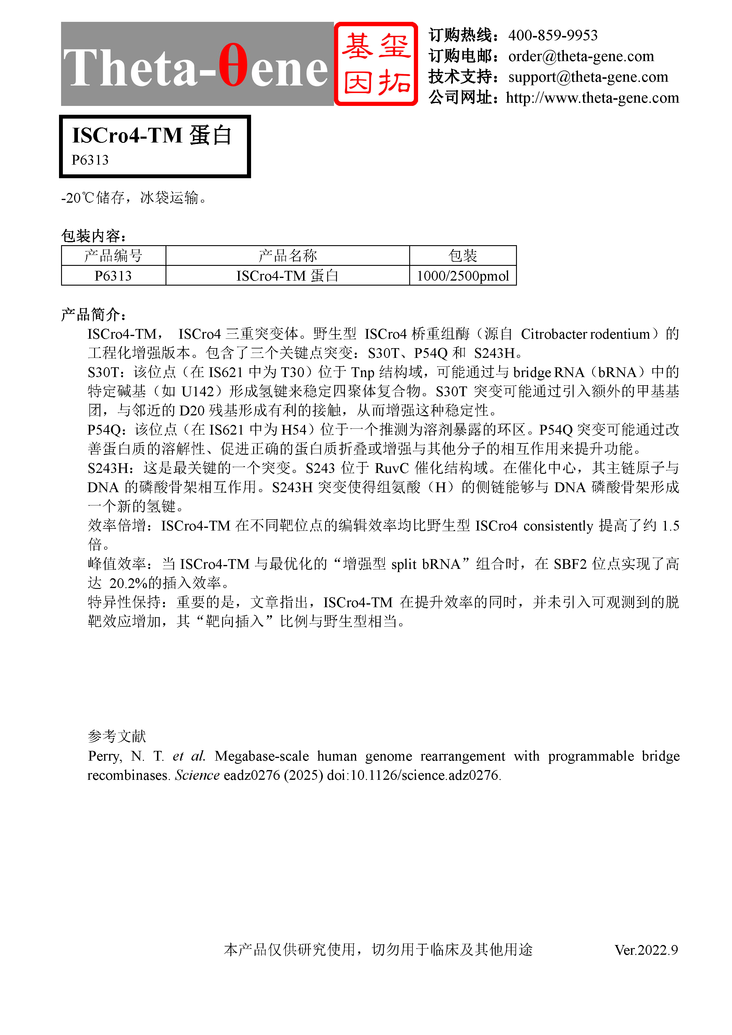 ISCro4-TM, ISCro4三重突变体。野生型 ISCro4桥重组酶(源自 Citrobacter rodentium)的工程化增强版本。包含了三个关键点突变:S30T、P54Q和 S243H。