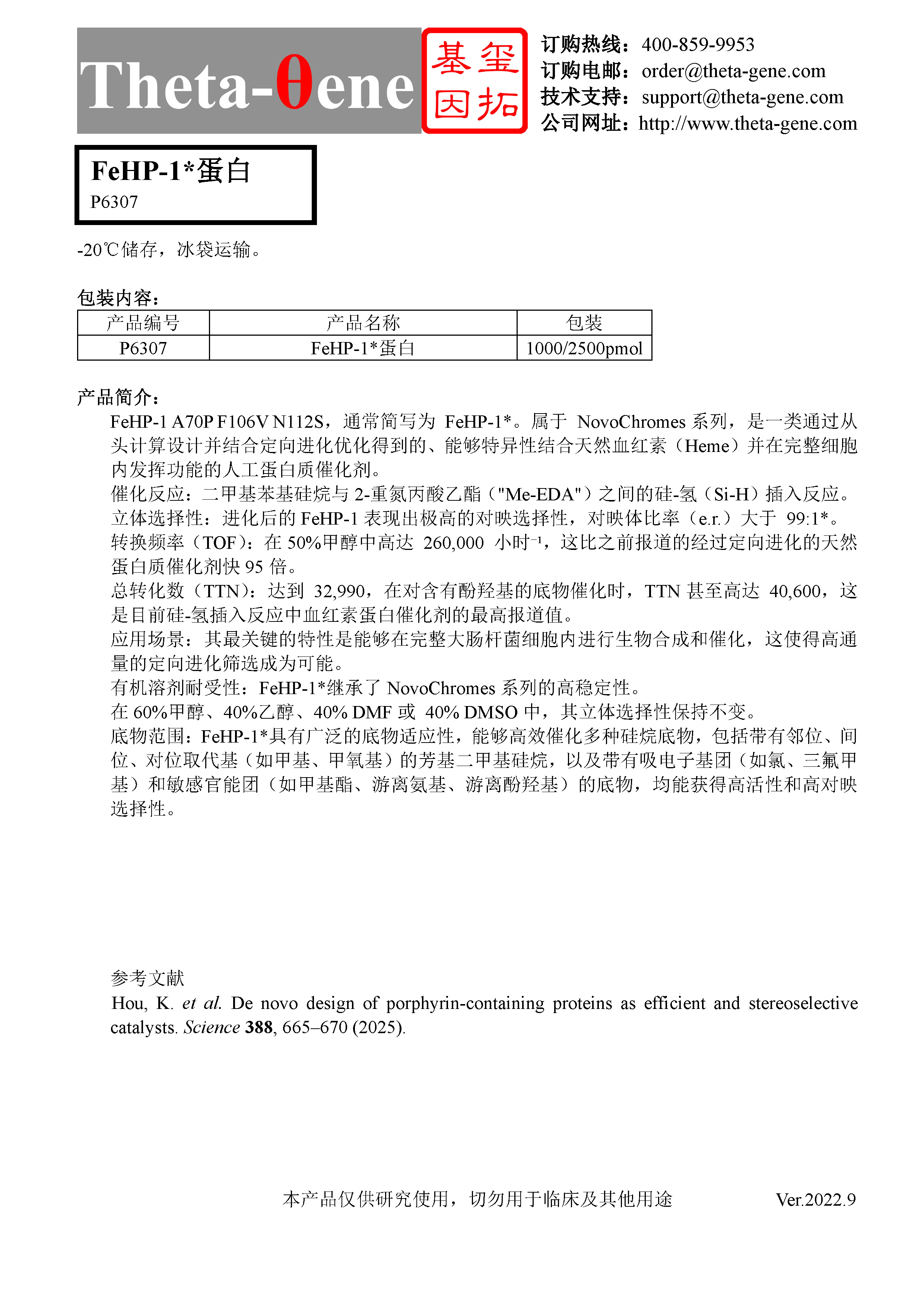 FeHP-1 A70P F106V N112S,通常简写为 FeHP-1*。属于 NovoChromes系列,是一类通过从头计算设计并结合定向进化优化得到的、能够特异性结合天然血红素(Heme)并在完整细胞内发挥功能的人工蛋白质催化剂。