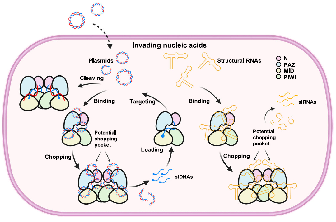 Argonaute (Ago) 蛋白是存在于真核生物和原核生物中的关键核酸酶。真核Ago (eAgos) 通过小干扰RNA (siRNA) 或 microRNA (miRNA) 进行RNA干扰的机制已被广泛研究。然而,原核Ago (pAgos) 在细菌防御中的工作机制,特别是在常温(中温)条件下,仍未被充分探索。